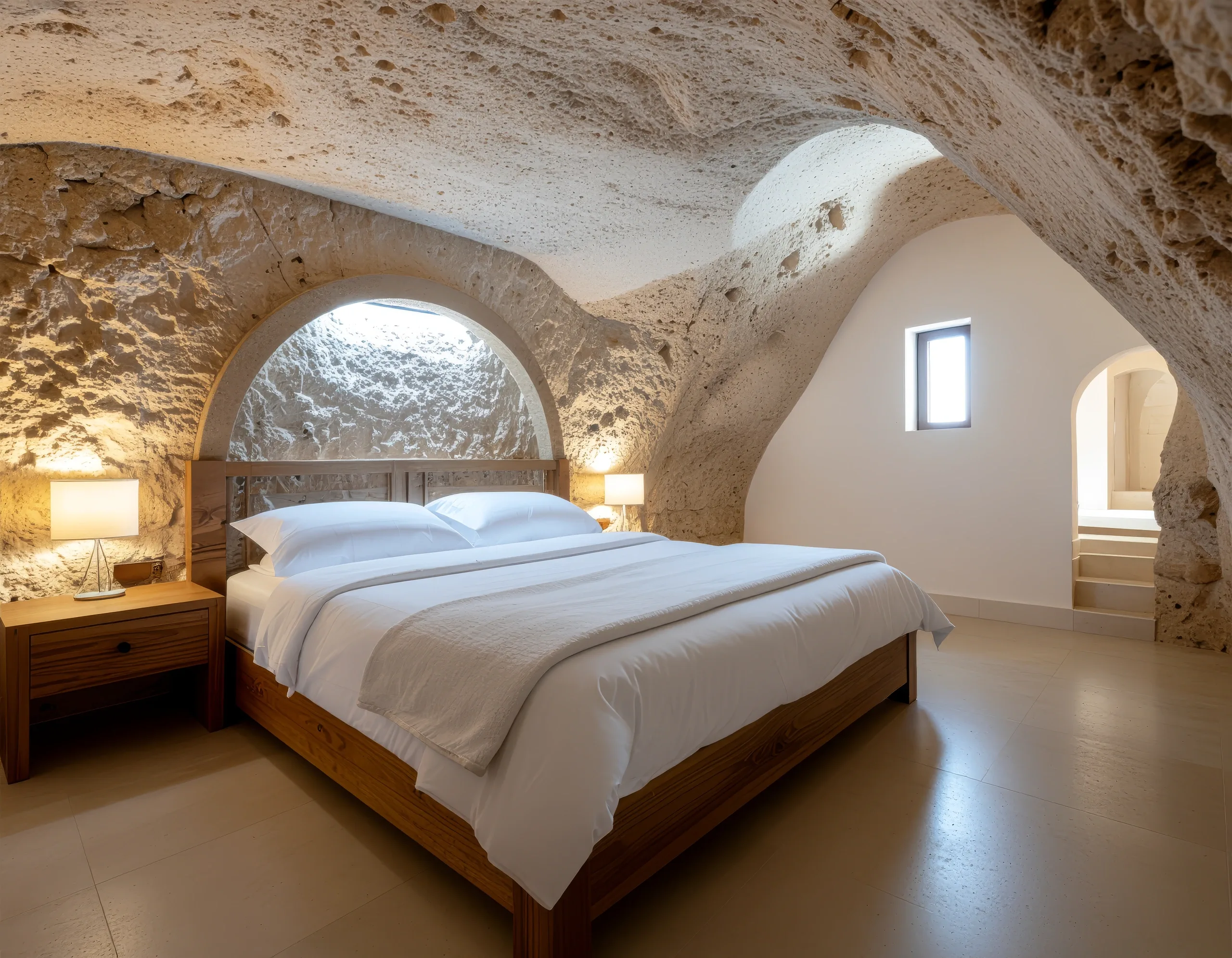 Daha geniş bir yaşam alanı sunan Deluxe Mağara Odalar, taş kemerler ve özgün mimari detaylarla zenginleştirilmiştir. Konfor ve estetiği bir arada arayan misafirler için idealdir.